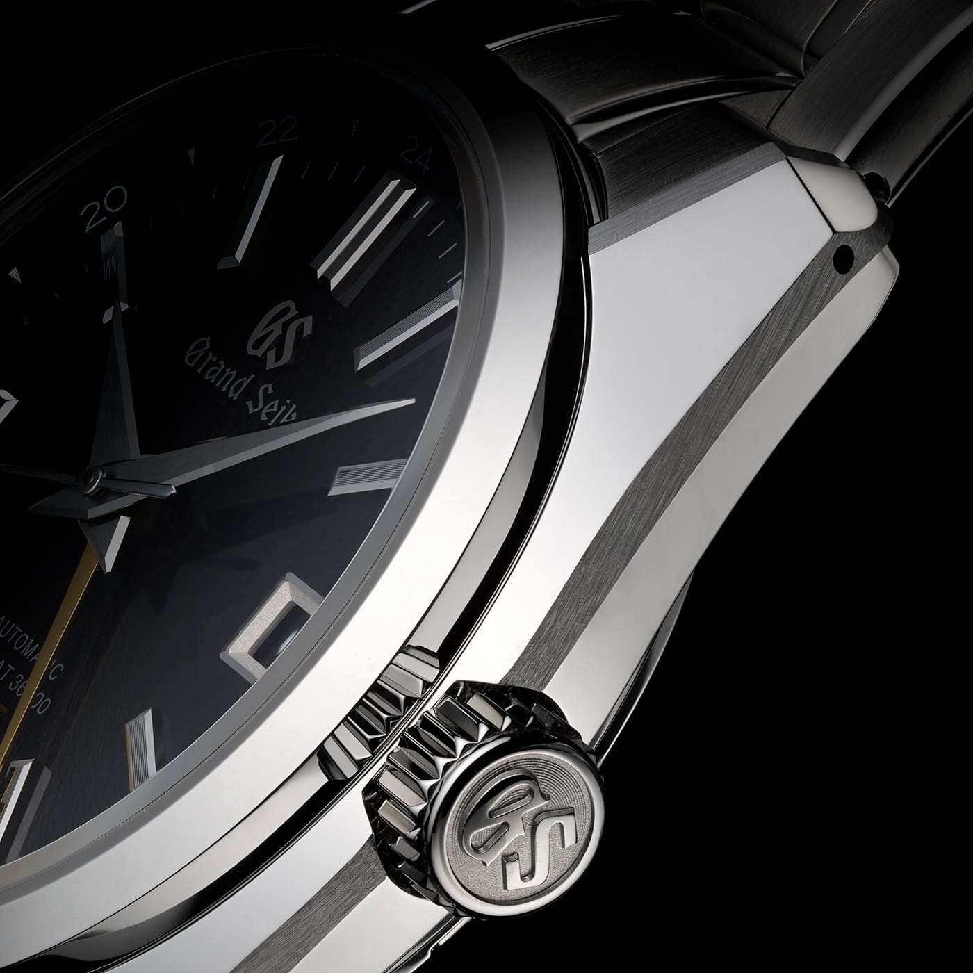 '폴리싱'이란 시계 표면을 매끄럽고 반짝이게 다듬는 연마 작업을 말합니다. GS의 '자랏츠(ザラッツ)' 폴리싱은 일반적인 '버핑(부드러운 천 등으로 문질러 광을 내는 방식)'과 조금 다릅니다. '버핑'은 필연적으로 케이스의 모서리(엣지)가 둥글어질 수 있는 반면, '자랏츠(ザラッツ)'는 회전하는 단단하고 평평한 '주석판'에 케이스 면을 직접 대고 갈아내는 '평면 연마' 기술입니다. 그 결과, 케이스의 모서리 선(엣지)이 칼처럼 날카롭게 살아있는, 왜곡이 거의 없는 거울면이 탄생합니다. 이 '빛과 그림자의 미학'은 희미한 빛이라도 반사시켜 시간을 읽게 하려는 '가독성'이라는 철학의 구현입니다.